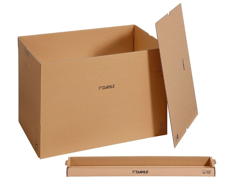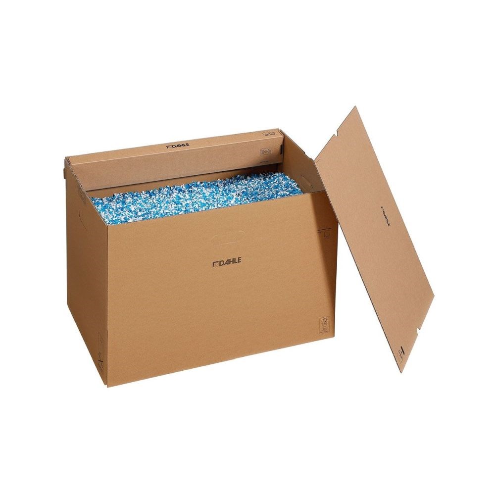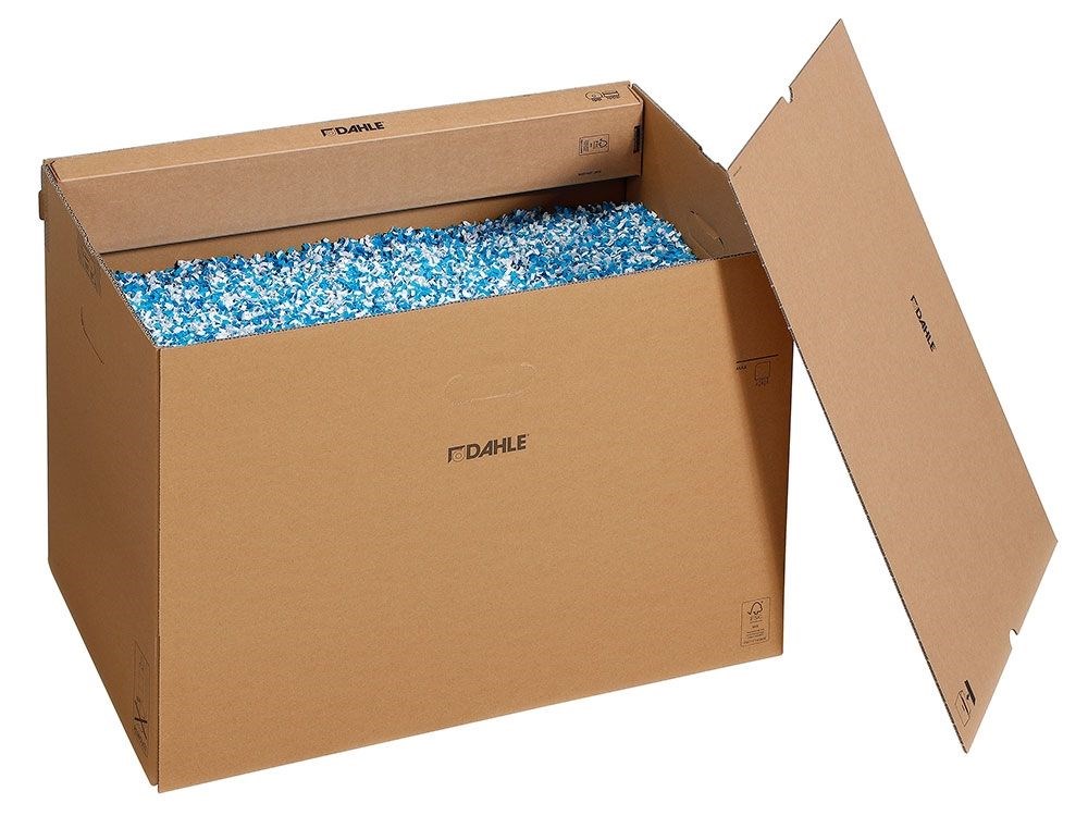 Kutija za otpad za Dahle profesionalne uništavače dokumenata, zapremine 30 litara, od valovitog kartona, u sklopu koje je i kutija za otpad za plastiku (npr. CD-a - napomena: ne mogu svi modeli usitnjavati CD-e/DVD-ove) i poklopac za prijenos, također izrađeni od valovitog kartona