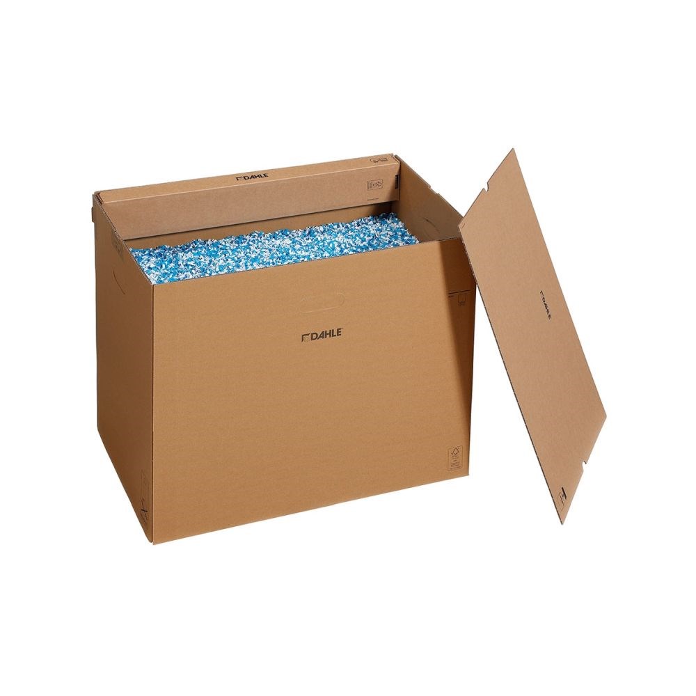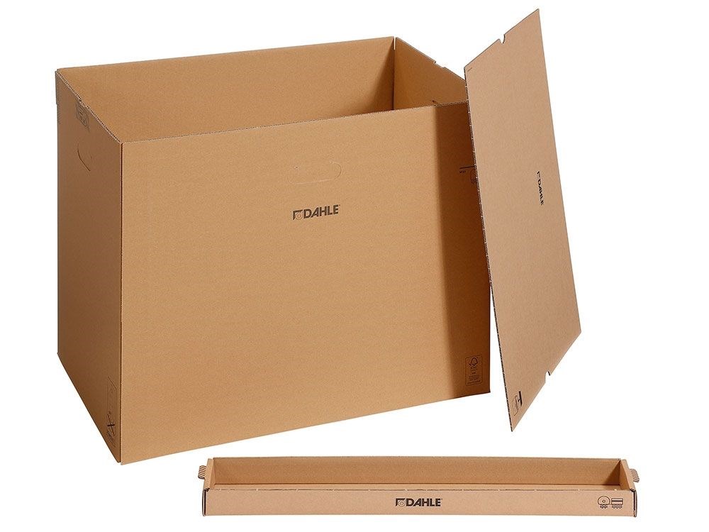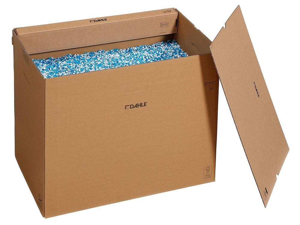 Kutija za otpad za Dahle profesionalne uništavače dokumenata, zapremine 30 litara, od valovitog kartona, u sklopu koje je i kutija za otpad za plastiku (npr. CD-a - napomena: ne mogu svi modeli usitnjavati CD-e/DVD-ove) i poklopac za prijenos, također izrađeni od valovitog kartona