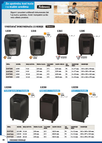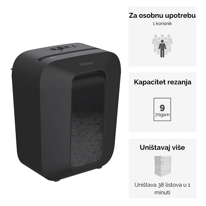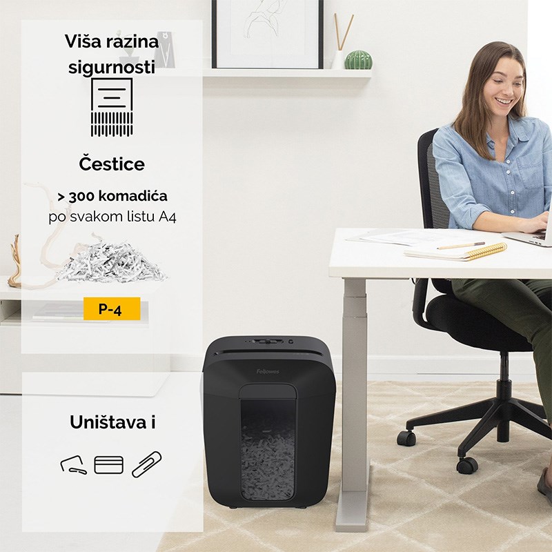 Manji osobni uništavač papira, dnevnog kapaciteta 100 listova. Umjerena upotreba u kući i kućnom uredu za pojedinačne korisnike. Automatski sistem uključivanja - isključivanja i zaštita od pregrijavanja